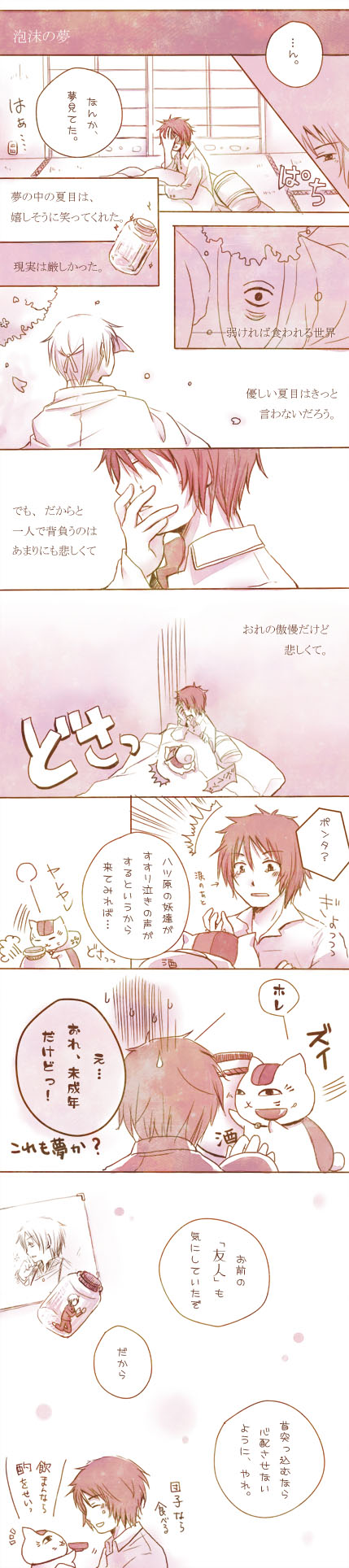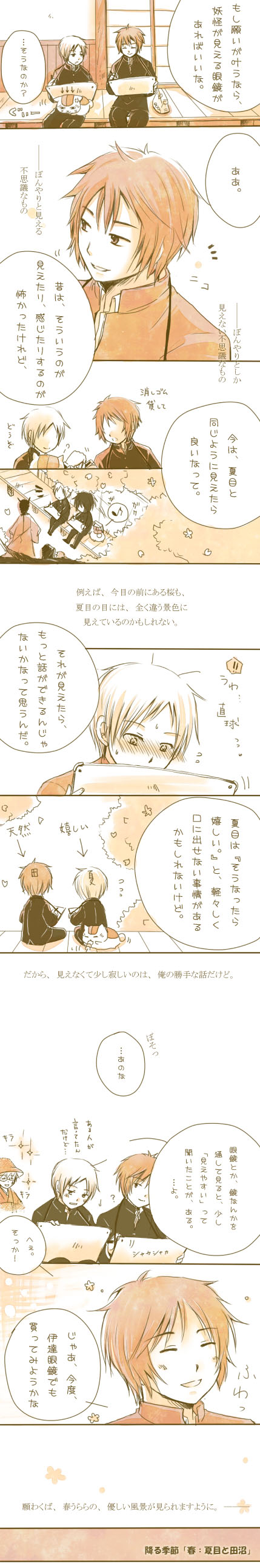 診断メーカーが「Riita317の次の新刊は『降る季節』です。」というので、夏目と過ごす四季とか!。夏目&だれかの4つのお話で構成されてたりだな。春:田沼、夏:ニャンコ先生、秋:名取の若様、冬:的場のご当主。そんな短編集をだな・・・!と思い余ってみました。田沼と夏目が話していたら、それだけでほのぼの可愛い。